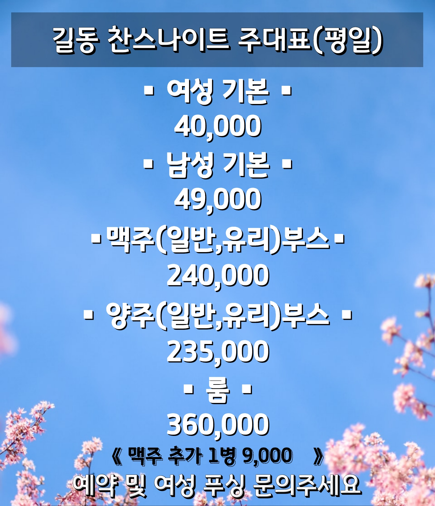| 길동 찬스나이트 연말 가격입니다.(2023.12.01) (0) | 2023.12.01 |